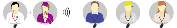 场景二 : 1个发射器(讲解员/导游)、1个接收器(助理需发言)与多个接收器(观众/团员)